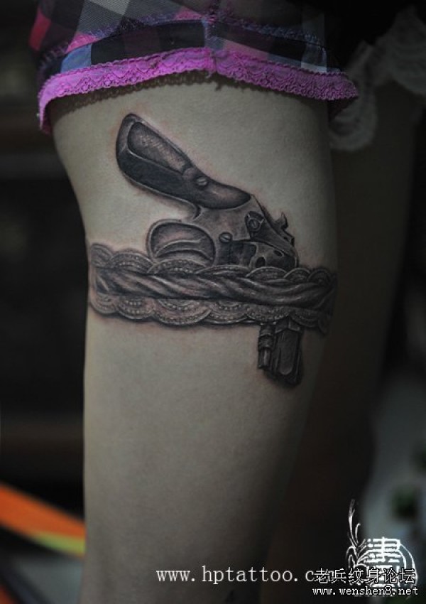 腿部蕾丝手枪纹身图案纹身图片_腿部纹身图案大全_纹身图吧