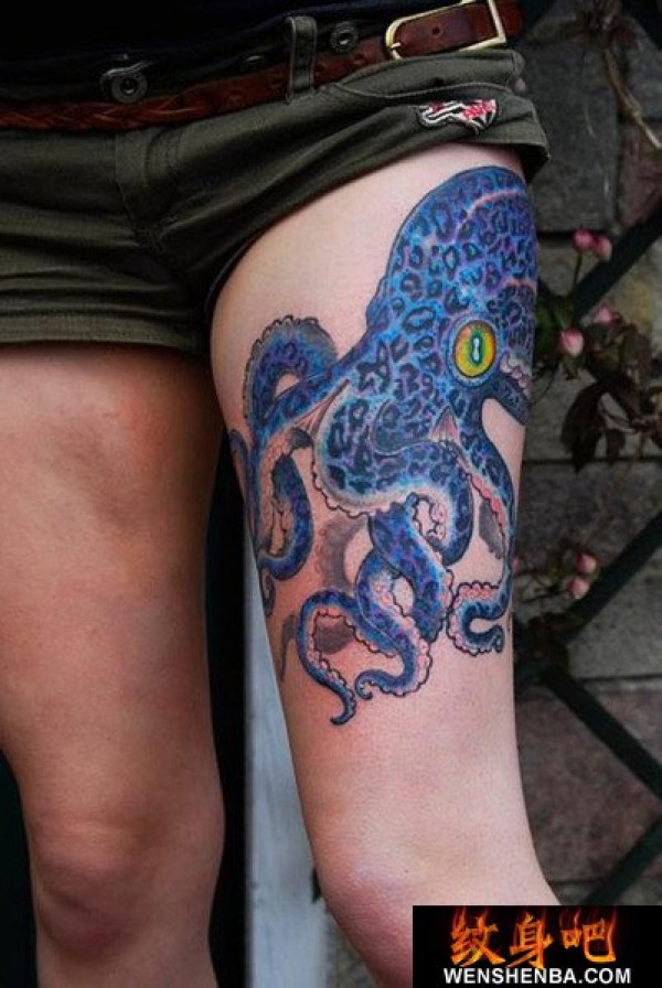 大腿蓝色章鱼纹身_腿部纹身图案大全_纹身图吧