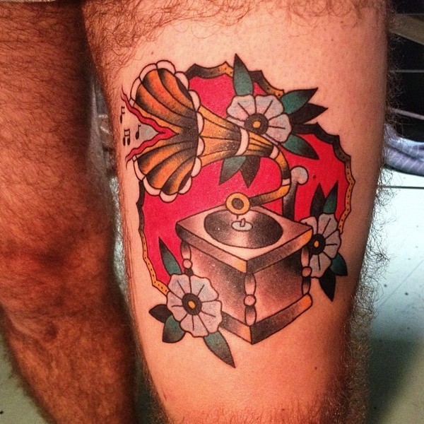 大腿彩色留声机纹身_腿部纹身图案大全_纹身图吧