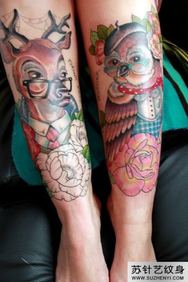 小腿猫头鹰和麋鹿纹身_腿部纹身图案大全_纹身图吧