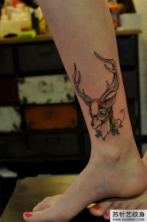 时尚小鹿头腿部纹身_腿部纹身图案大全_纹身图吧