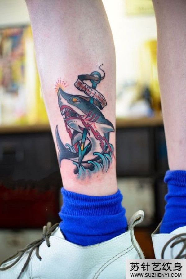 箭刺鲨鱼小腿纹身_腿部纹身图案大全_纹身图吧