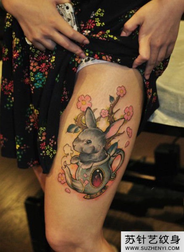 大腿樱花萌兔子纹身_腿部纹身图案大全_纹身图吧