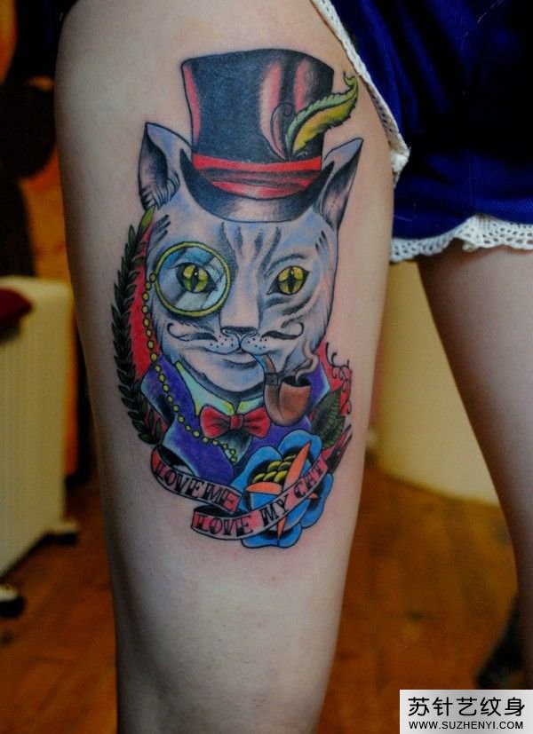 大腿侦探猫咪纹身_腿部纹身图案大全_纹身图吧