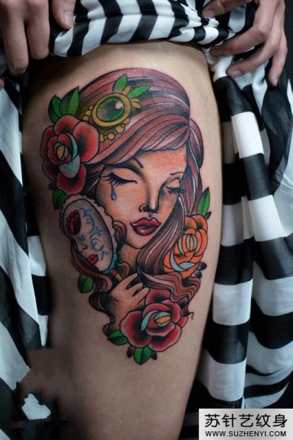 大腿落泪美女纹身_腿部纹身图案大全_纹身图吧