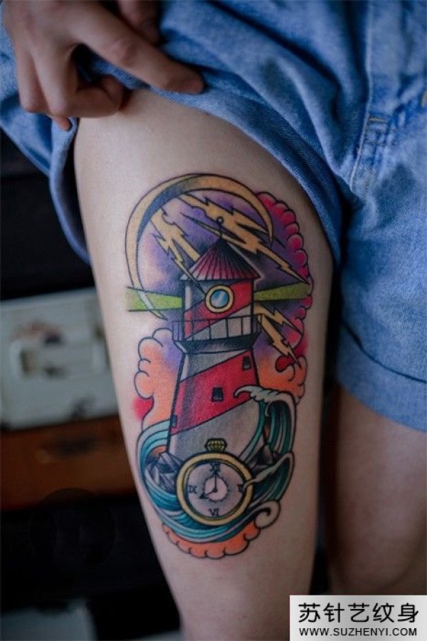 腿部灯塔与指南针纹身_腿部纹身图案大全_纹身图吧