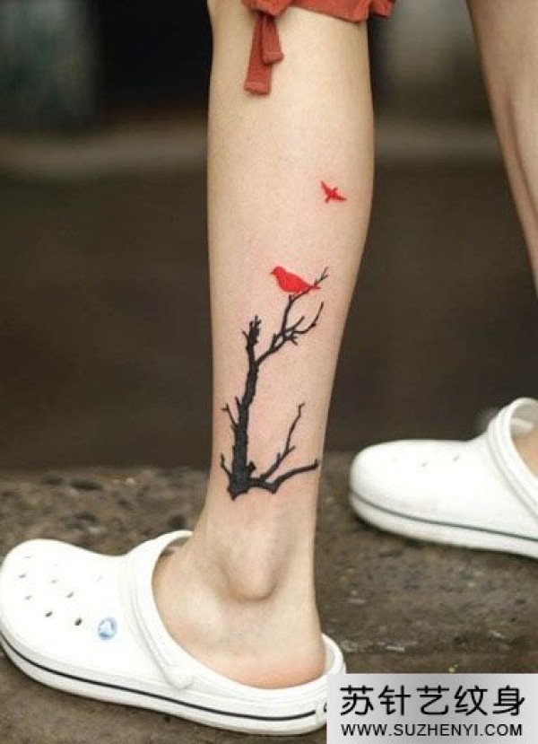 小腿树枝小鸟刺青_腿部纹身图案大全_纹身图吧
