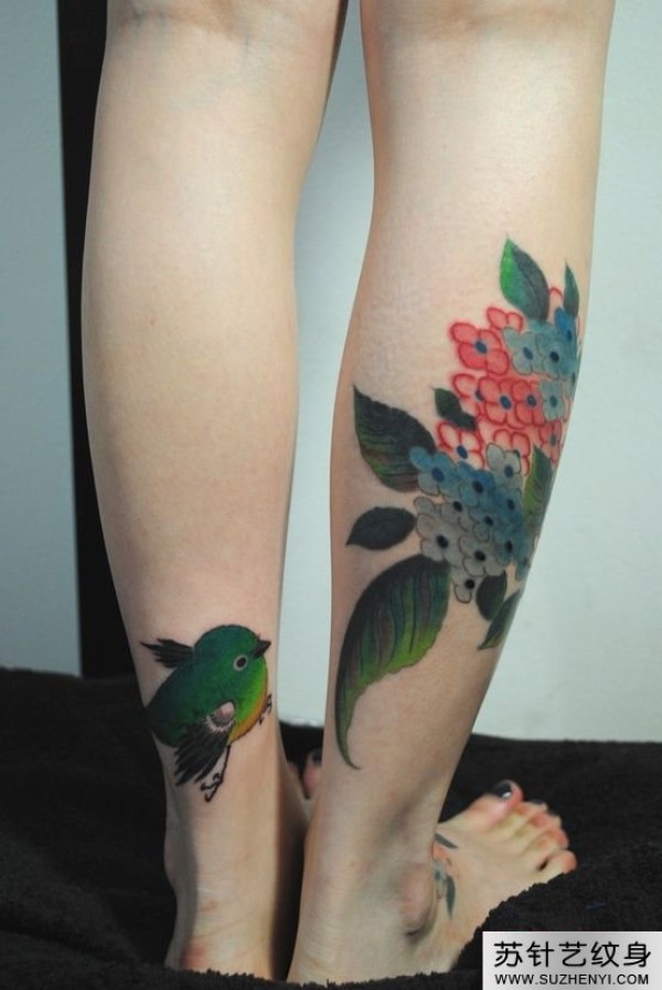 小腿花与小鸟纹身_腿部纹身图案大全_纹身图吧