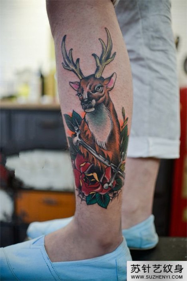 彩色麋鹿小腿纹身图_腿部纹身图案大全_纹身图吧
