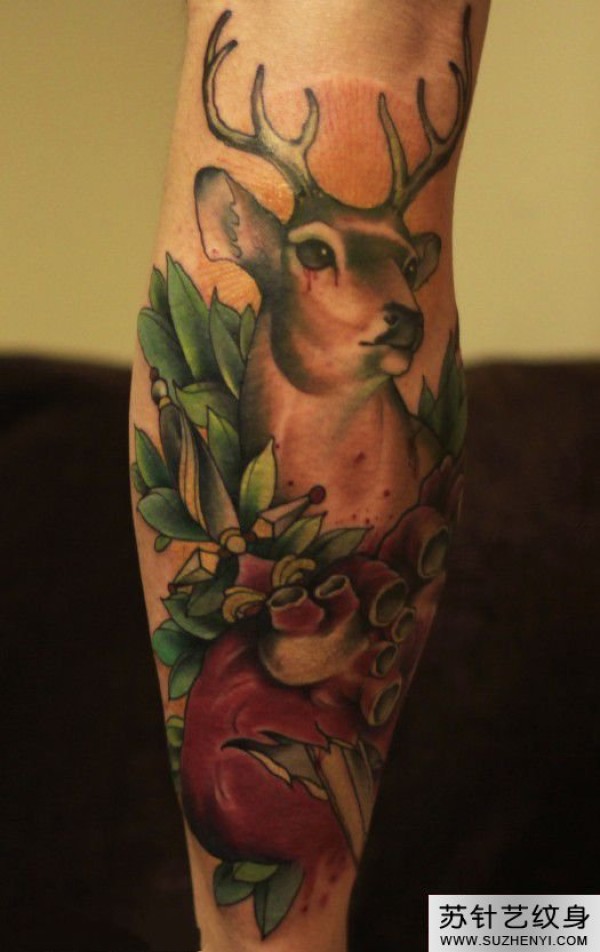 彩色麋鹿小腿纹身_腿部纹身图案大全_纹身图吧