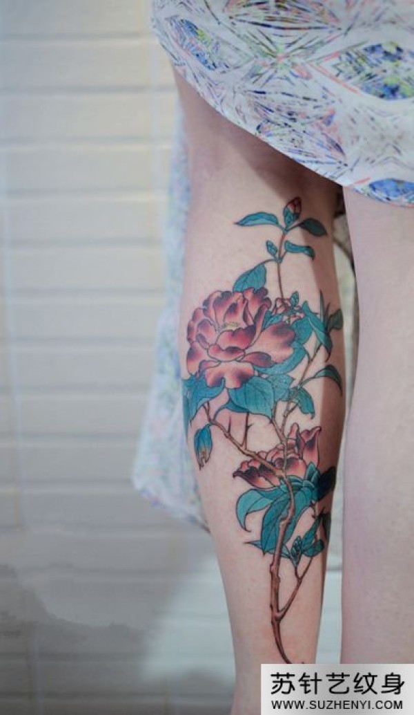 盛开牡丹花小腿纹身_腿部纹身图案大全_纹身图吧