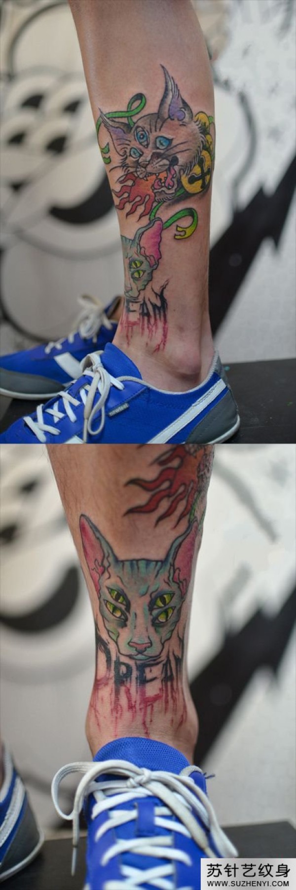 创意猫咪小腿霸气纹身_腿部纹身图案大全_纹身图吧