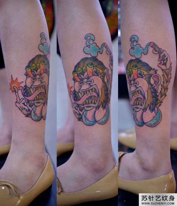 抽烟母猴子小腿纹身_腿部纹身图案大全_纹身图吧