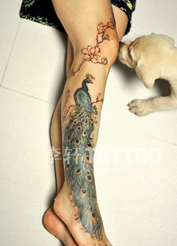 李轩作品小腿部孔雀纹身图案_腿部纹身图案大全_纹身图吧