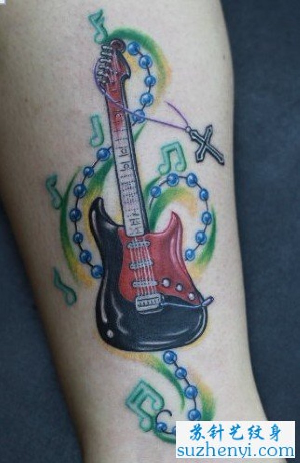 腿部彩色贝斯吊链音符纹身_腿部纹身图案大全_纹身图吧