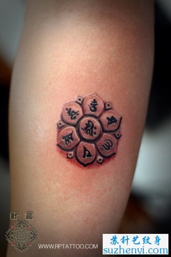 一枚腿部莲花台六字真言纹身图案_腿部纹身图案大全_纹身图吧