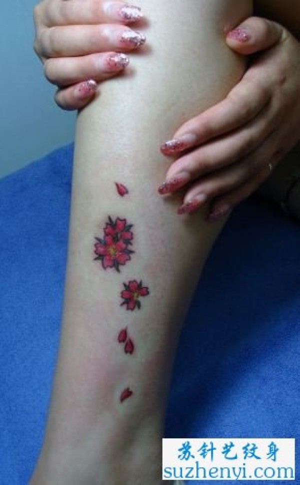 腿部彩色樱花纹身_腿部纹身图案大全_纹身图吧