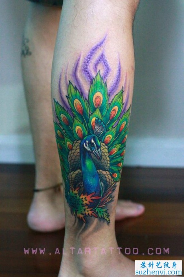 腿部彩色孔雀纹身_腿部纹身图案大全_纹身图吧