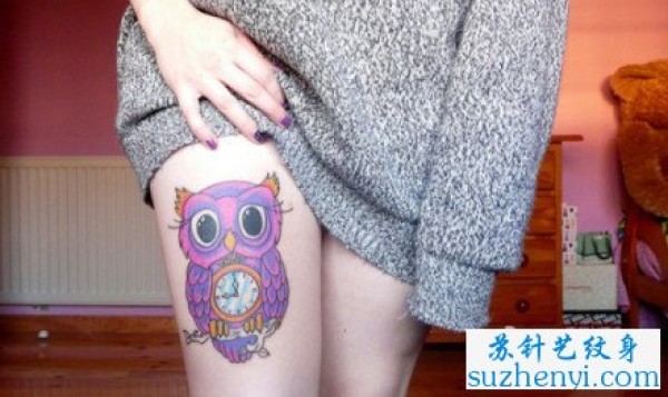 腿部猫头鹰时钟纹身_腿部纹身图案大全_纹身图吧