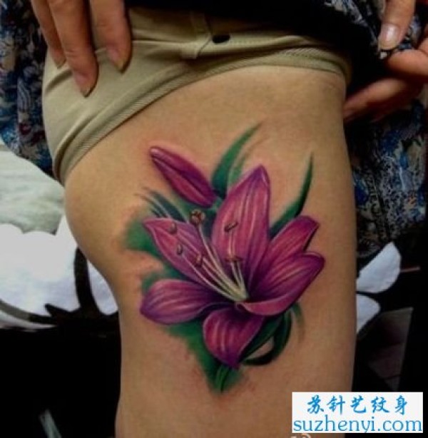 腿部艳丽彩色百合花纹身_腿部纹身图案大全_纹身图吧