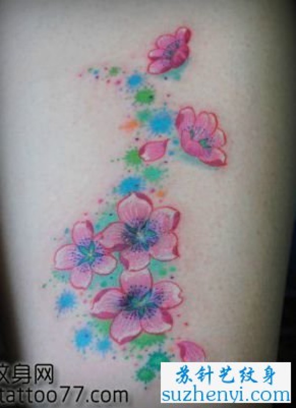 腿部彩色樱花纹身_腿部纹身图案大全_纹身图吧