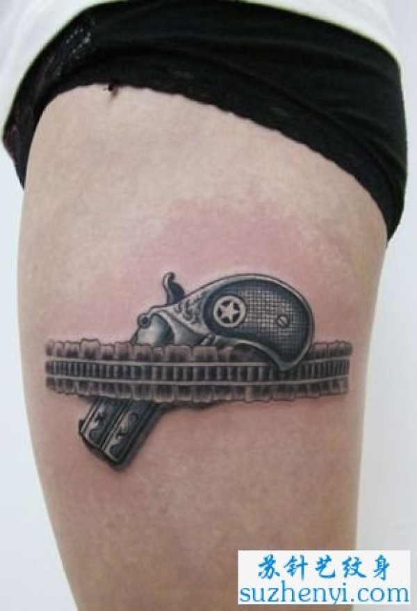 大腿蕾丝手枪纹身_腿部纹身图案大全_纹身图吧