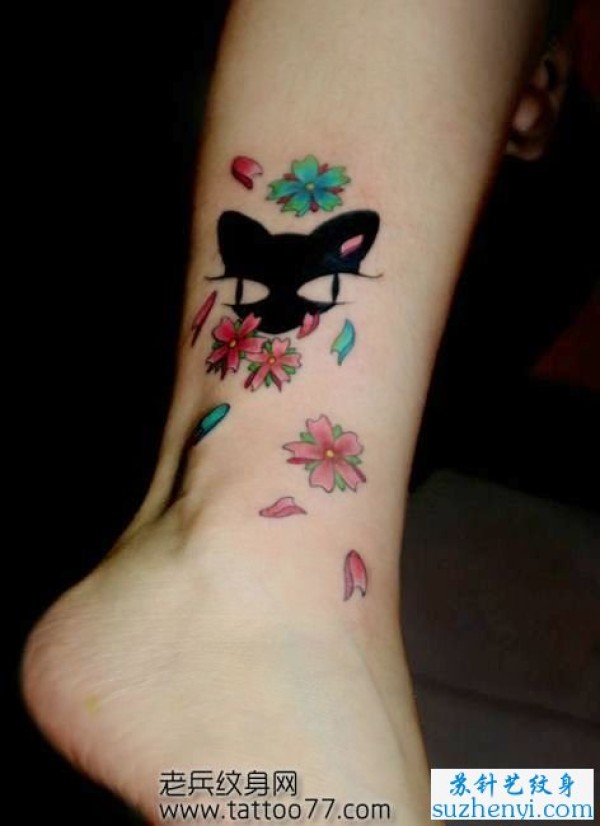 腿部猫咪樱花纹身_腿部纹身图案大全_纹身图吧