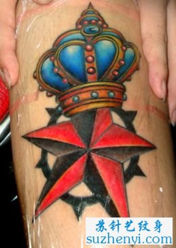 腿部彩色五芒星皇冠纹身_腿部纹身图案大全_纹身图吧