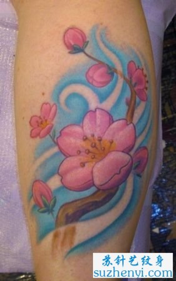 腿部彩色樱花纹身_腿部纹身图案大全_纹身图吧