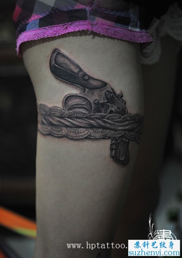 腿部蕾丝手枪纹身_腿部纹身图案大全_纹身图吧