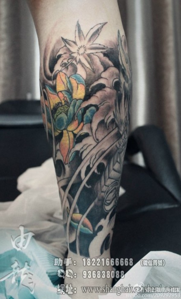 腿部蛇彩色莲花纹身图案_腿部纹身图案大全_纹身图吧