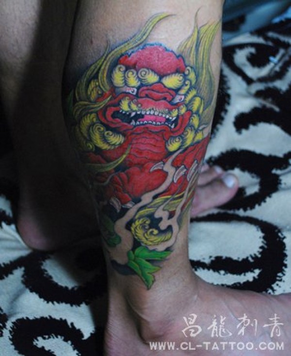 小腿彩色唐狮_男士大图_腿部纹身图案大全_纹身图吧