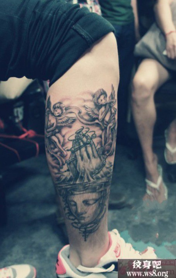 玛利亚的小天使花腿刺青图案_天使纹身图案大全_纹身图吧