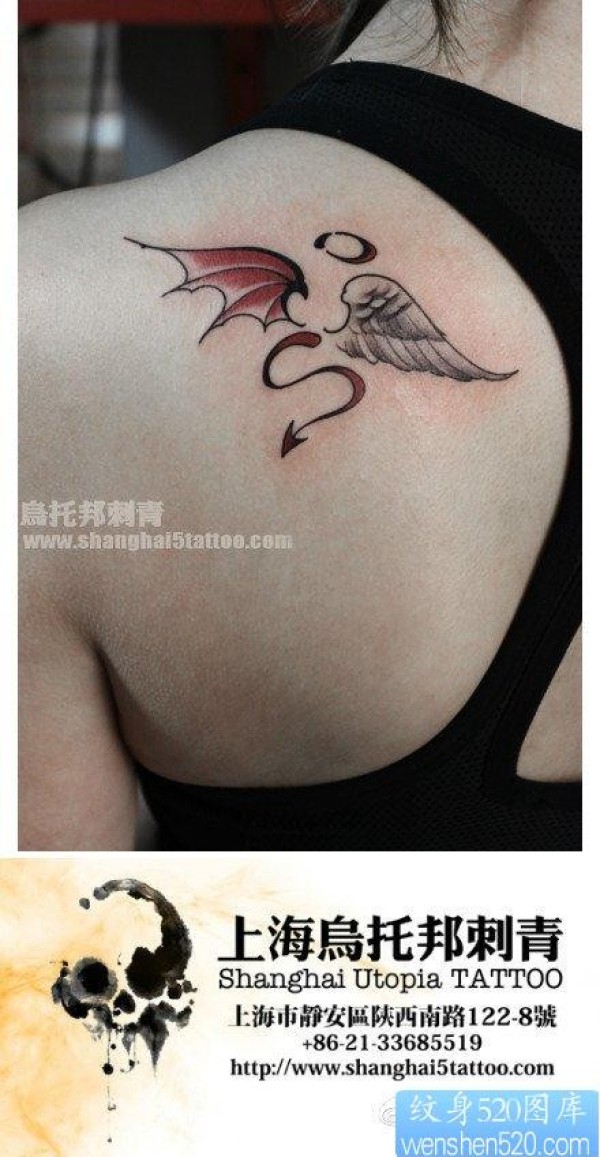 女人肩背潮流流行的天使与恶魔的翅膀纹身图片_天使纹身图案大全_纹身图吧