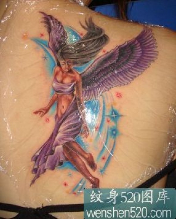 后背紫色长翅膀的女天使_天使纹身图案大全_纹身图吧