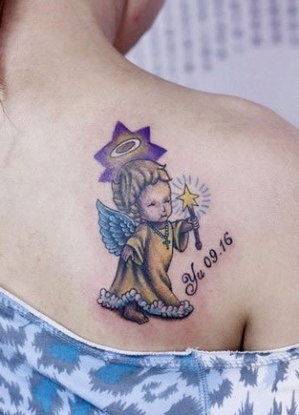 美女侧背上的彩色天使纹身图案大全手拿魔法棒_天使纹身图案大全_纹身图吧