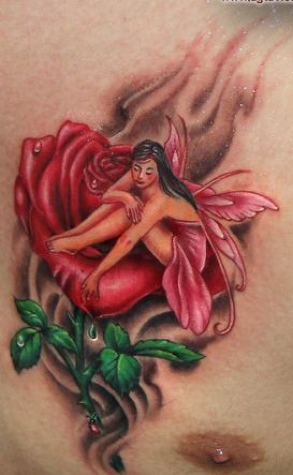 胸部彩色精灵玫瑰纹身图片纹身图案_天使纹身图案大全_纹身图吧