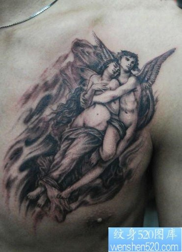 胸部经典的黑灰天使纹身图片_天使纹身图案大全_纹身图吧
