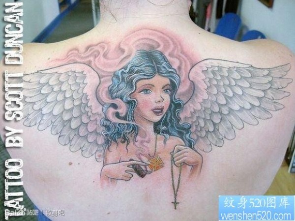 女人背部经典流行的卡通天使纹身图片_天使纹身图案大全_纹身图吧