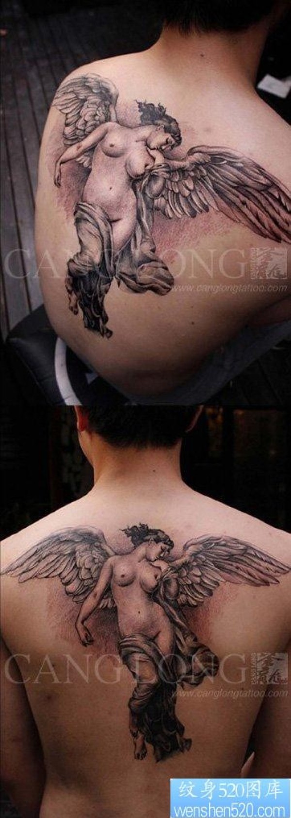男性后背前卫经典的黑白天使纹身图片_天使纹身图案大全_纹身图吧