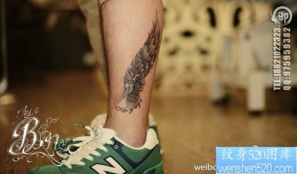 男性腿部经典的黑白机械翅膀纹身图片_天使纹身图案大全_纹身图吧