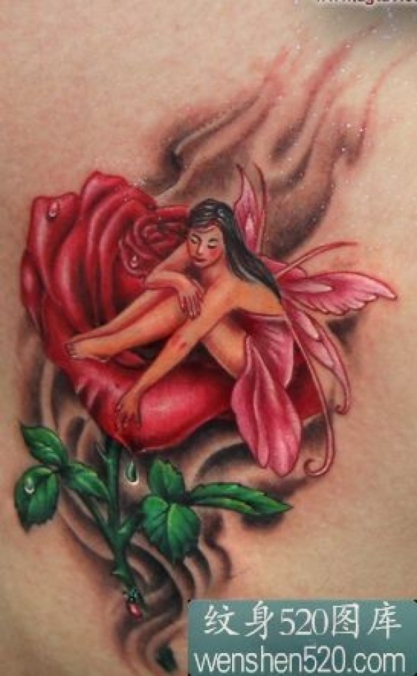玫瑰花朵中的精灵纹身_天使纹身图案大全_纹身图吧