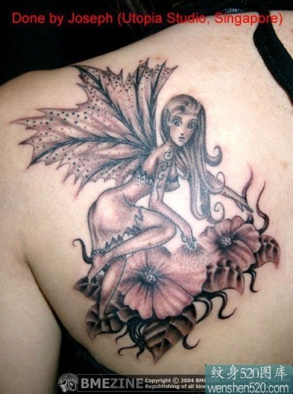 花朵上的带翅膀的女子纹身_天使纹身图案大全_纹身图吧