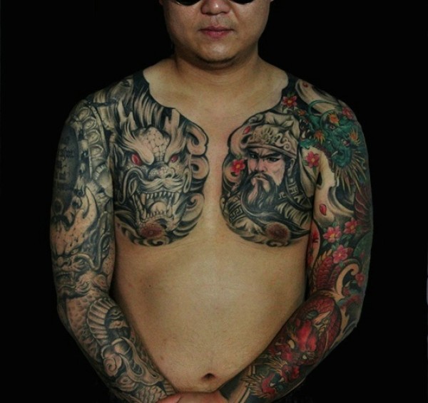 超级霸气的双半甲彩色关公纹身刺青