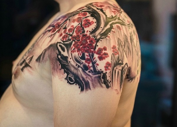 山水与树枝的个性水彩图腾纹身刺青