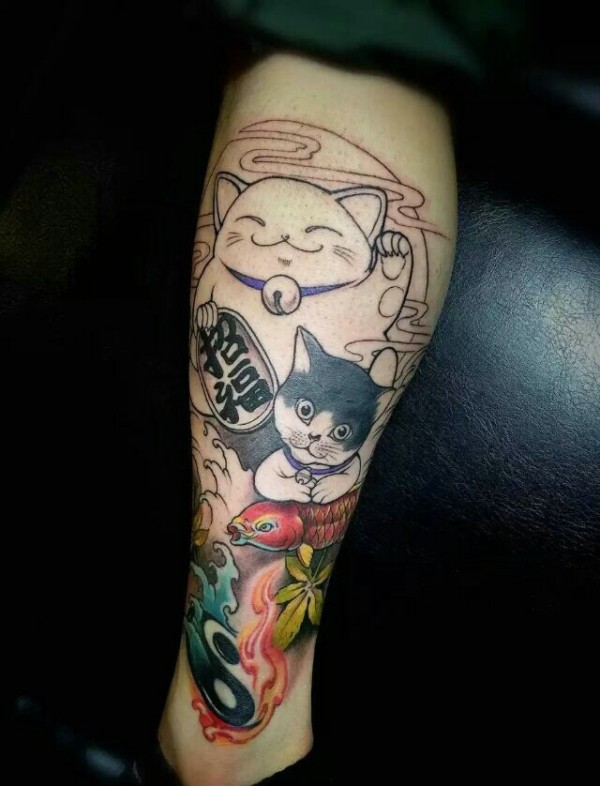可爱调皮的腿部招财猫纹身图案