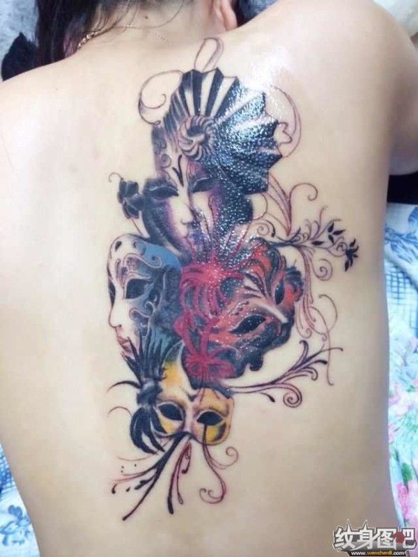 女生后背精致面具纹身(漳州云霄腾云刺青)