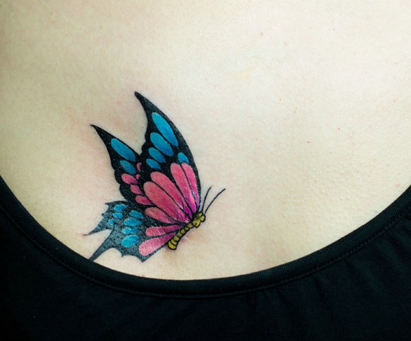 落在女生胸前的彩色3d蝴蝶纹身唯美好看