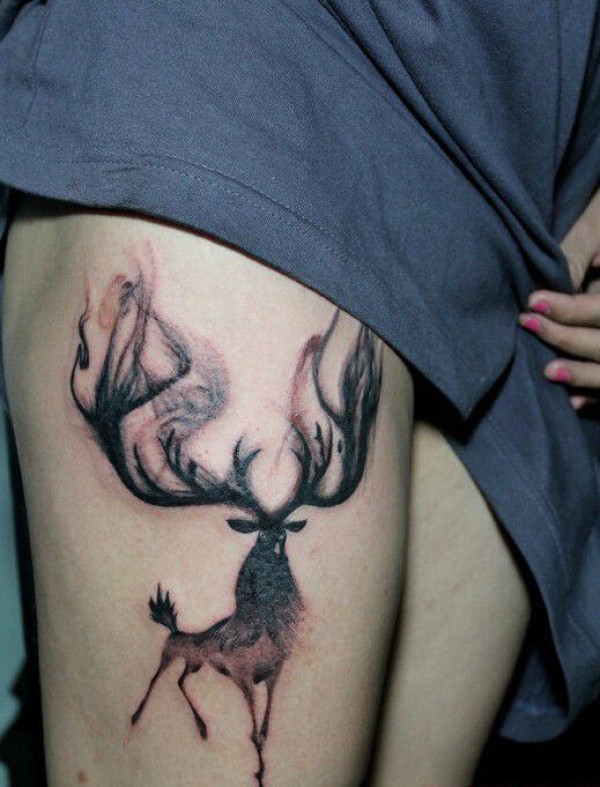 大腿水墨风麋鹿纹身图案