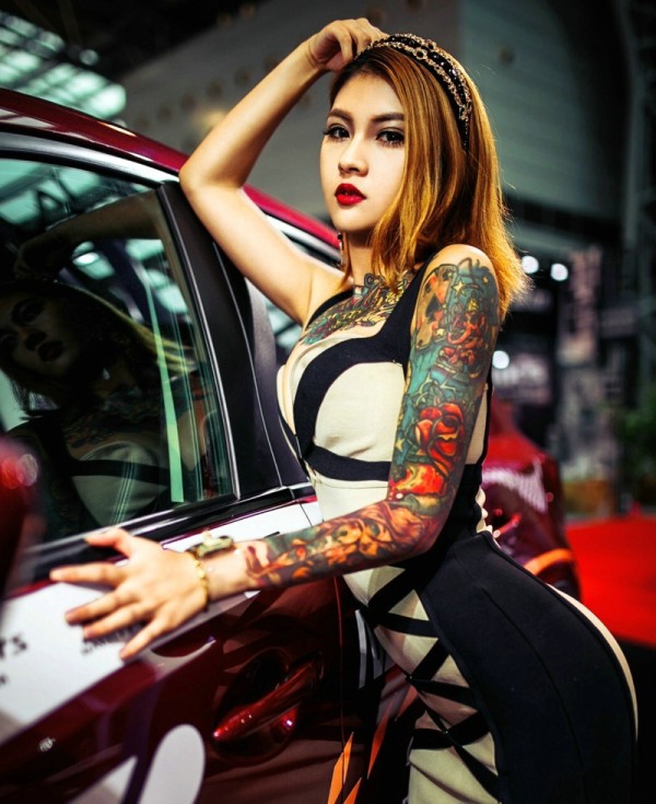 前凸后翘的性感车模花臂纹身亮瞎眼